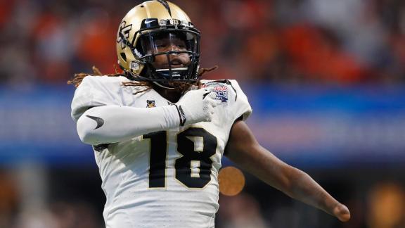 Knights' Antwan Collier makes the crucial interception of Jarrett Stidham in the final seconds of the Chick-fil-A Peach Bowl to seal a win and undefeated season for UCF.